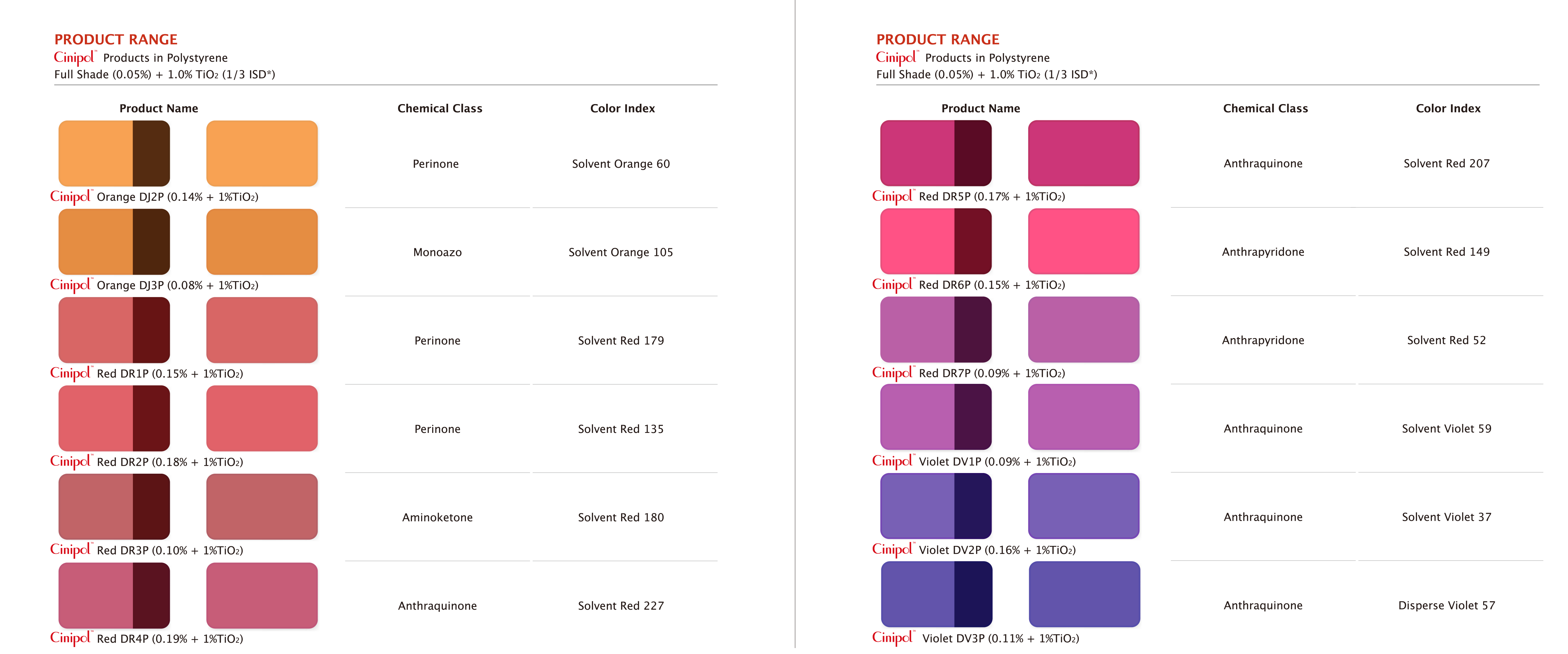 先珀®(Cinipol®)系列為高性能聚合物可溶性顏料。具有高純度,高耐溫,顏色艷麗等特點(diǎn)。廣泛適用于聚對(duì)苯二甲酸乙二醇酯(PET)、聚碳酸酯(PC)、聚甲基丙烯酸甲酯(PMMA)、丙烯腈-丁二烯-苯乙烯(ABS)、尼龍(PA)等多種工程塑料體系及聚酯纖維(PES)的著色。該系列優(yōu)異的溶解性和耐溫性使產(chǎn)品在工程塑料/合成纖維加工過程中易于分散使用,并可滿足各類制品戶內(nèi)外的耐光/耐候使用要求。本系列產(chǎn)品亦可用于需要與食品直接接觸的塑料包裝制品中。